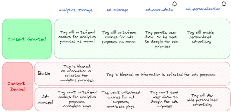 Il introduit deux nouveaux signaux – ad_user_data et ad_personalization – qui complètent les signaux existants analytics**_storage et ad_storage.**Ces signaux permettent à Google d’adapter le comportement des balises selon le niveau de consentement obtenu.