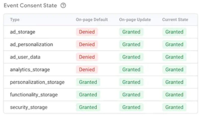 Dans l’aperçu GTM, un onglet “Consentement” est affiché pour chaque événement enregistré dans le dataLayer. Il présente les informations suivantes :