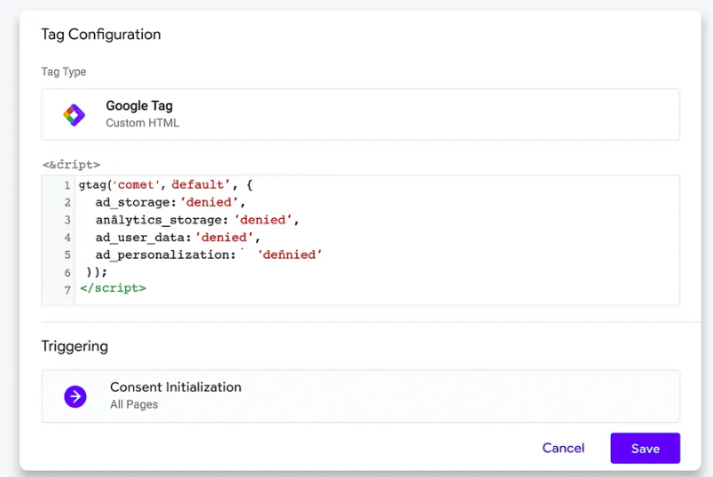 Étape 2 : *Ajouter la balise 'default' dans GTMjsgtag('consent', 'default', { ad_storage: 'denied', analytics_storage: 'denied', ad_user_data: 'denied', ad_personalization: 'denied'});*Cette balise doit être déclenchée via un trigger 'Consent Initialization' sur toutes les pages.