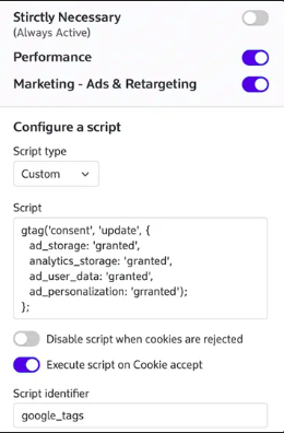 Étape 3 : Ajouter la balise 'update' après le consentement```jsgtag('consent', 'update', { ad_storage: 'granted', analytics_storage: 'granted', ad_user_data: 'granted', ad_personalization: 'granted'}). Cette balise est déclenchée par la CMP dès que l’utilisateur accepte les cookies.