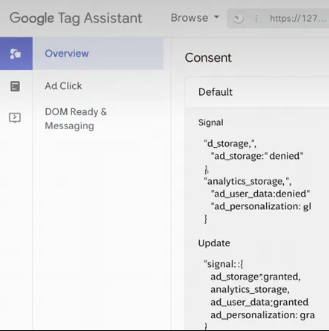 - Consulter l’état de chaque signal de consentement (ad_storage, analytics_storage, etc.)