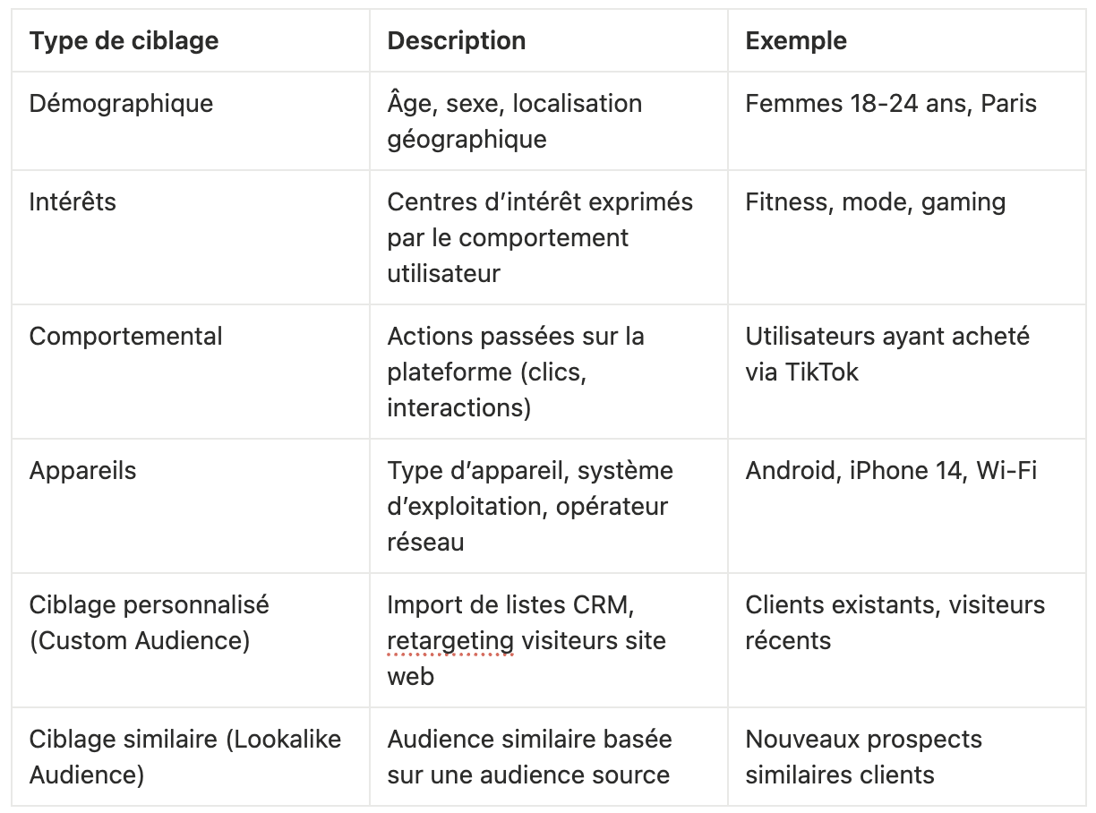 Le ciblage avancé regroupe l’ensemble des options de segmentation d’audience proposées par TikTok Ads Manager, permettant de diffuser vos publicités auprès des utilisateurs les plus pertinents selon plusieurs critères.