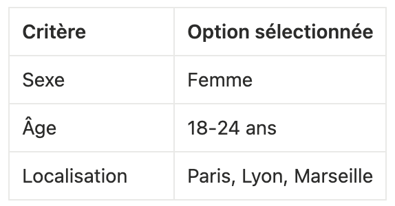 N’hésitez pas à combiner plusieurs critères (démographiques, intérêts, comportements) pour affiner au maximum votre cible.
