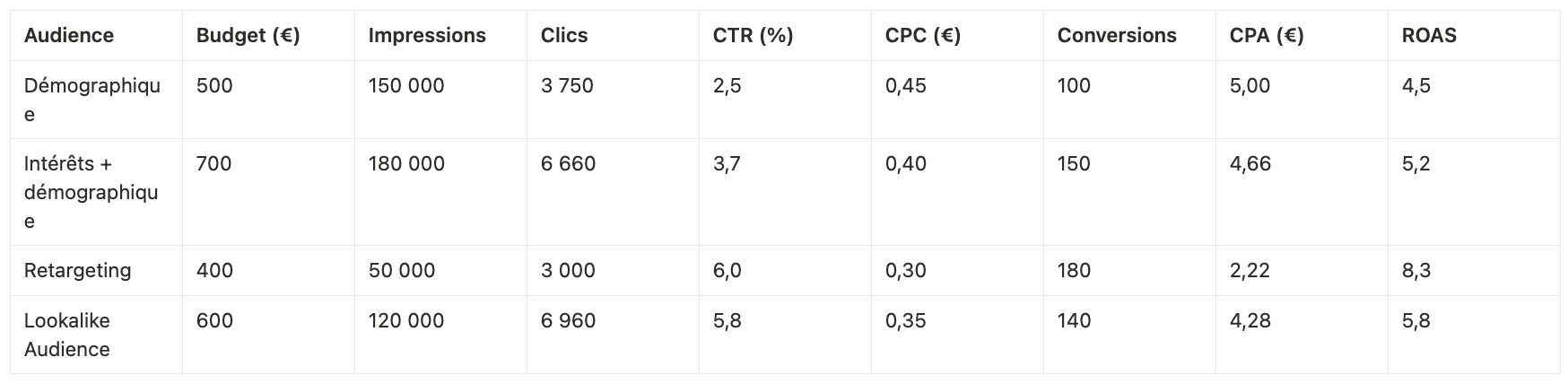 - Phase 2 : Ajout du retargeting des visiteurs site web + Lookalike à partir des acheteurs : CPA réduit à 11 €.