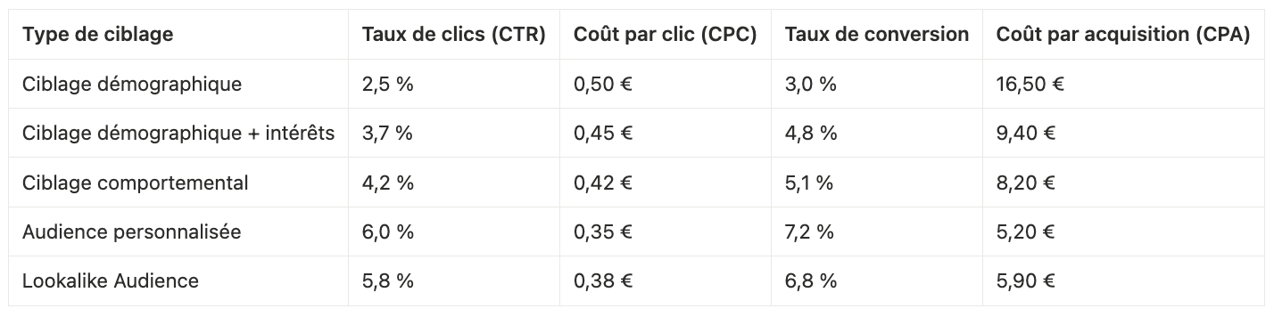 Tableau comparatif des performances selon le type de ciblage (données fictives)