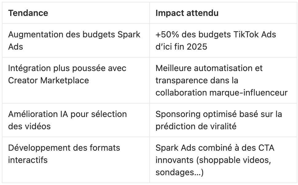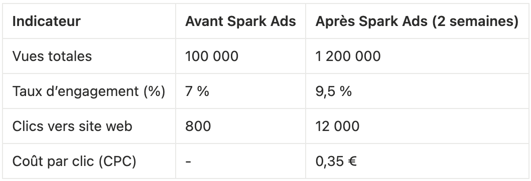 Les campagnes Spark Ads tendent à générer un meilleur retour sur investissement grâce à un engagement organique boosté, un coût d’acquisition souvent plus faible, et une fidélisation accrue des audiences.