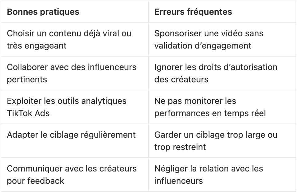 Pour sponsoriser les contenus d’influenceurs, assurez-vous d’obtenir le code d’autorisation nécessaire. Ce processus peut s’automatiser via la plateforme TikTok Creator Marketplace. Favorisez les créateurs dont l’audience correspond à votre cible.